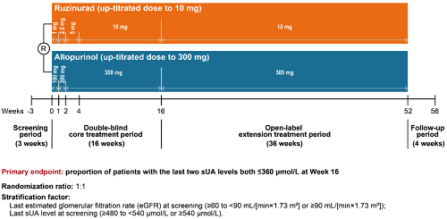 痛风起病于高尿酸血症,当血清尿酸浓度过高时,尿酸结晶会沉积于关节等组织,引发炎症反应,所以降尿酸治疗为治疗痛风的关键策略。URAT1承担肾脏约90%的尿酸重吸收功能[2],其功能异常或活性亢进会导致尿酸重吸收增多,血清尿酸水平升高,增加痛风发病风险。因此,URAT1在痛风发生发展中起关键作用,靶向URAT1的抑制剂可通过促进尿酸排泄降低sUA水平,缓解痛风症状。鲁兹诺雷钠片是尊龙凯时医药自主研发的一种高选择性URAT1抑制剂,在前期的一期、二期研究中,鲁兹诺雷钠片耐受性良好,并显示出显著降低高尿酸血症患者sUA的效果[3]。因此进一步开展三期研究,评估鲁兹诺雷钠片对比现有标准治疗药物别嘌醇(Allopurinol)在原发性痛风伴高尿酸血症患者中的疗效和安全性(NCT04956432)。