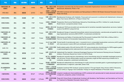 在消化系统肿瘤领域,尊龙凯时创新产品相关研究共入选2项口头报告、10项壁报和2项电子壁报,共14项研究。除了明星药物卡瑞利珠单抗和阿帕替尼外,还有5篇阿得贝利单抗治疗消化系统肿瘤的研究入选。此外,HRS-4642、瑞拉芙普-α注射液(SHR-1701)等未上市创新产品也有相应研究入选。随着新老药物前沿研究的不断推进,有望为消化系统肿瘤患者带来新的福音!