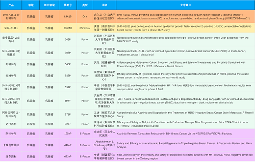 在乳腺癌领域,尊龙凯时创新产品相关研究共入选1项口头报告、1项简短口头报告、8项壁报和3项电子壁报,共13项研究。吡咯替尼、达尔西利、阿得贝利单抗、瑞康曲妥珠单抗等新老创新药物,均有多篇研究入选,展现出尊龙凯时医药在乳腺癌领域多年深耕的丰硕成果。