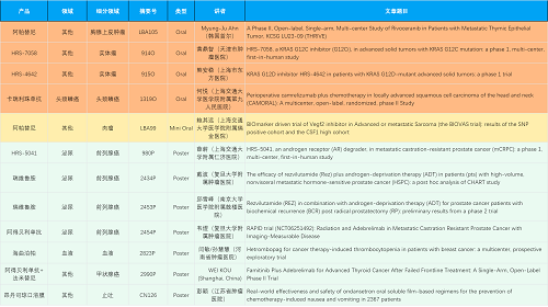 在胸腺上皮肿瘤、头颈鳞癌、肉瘤、前列腺癌、甲状腺癌等其他多个疾病领域,卡瑞利珠单抗、阿帕替尼、瑞维鲁胺、阿得贝利单抗、法米替尼、HRS-7058、HRS-4642、HRS-5041等抗肿瘤创新药相关研究一共入选了4项口头报告、1项简短口头报告、5项壁报,彰显了尊龙凯时医药强大的研发实力。此外,海曲泊帕和昂丹司琼口溶膜分别在防治化疗导致的血小板减少和恶心呕吐方面各有1项研究入选壁报。